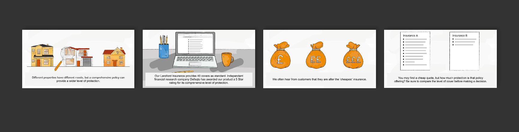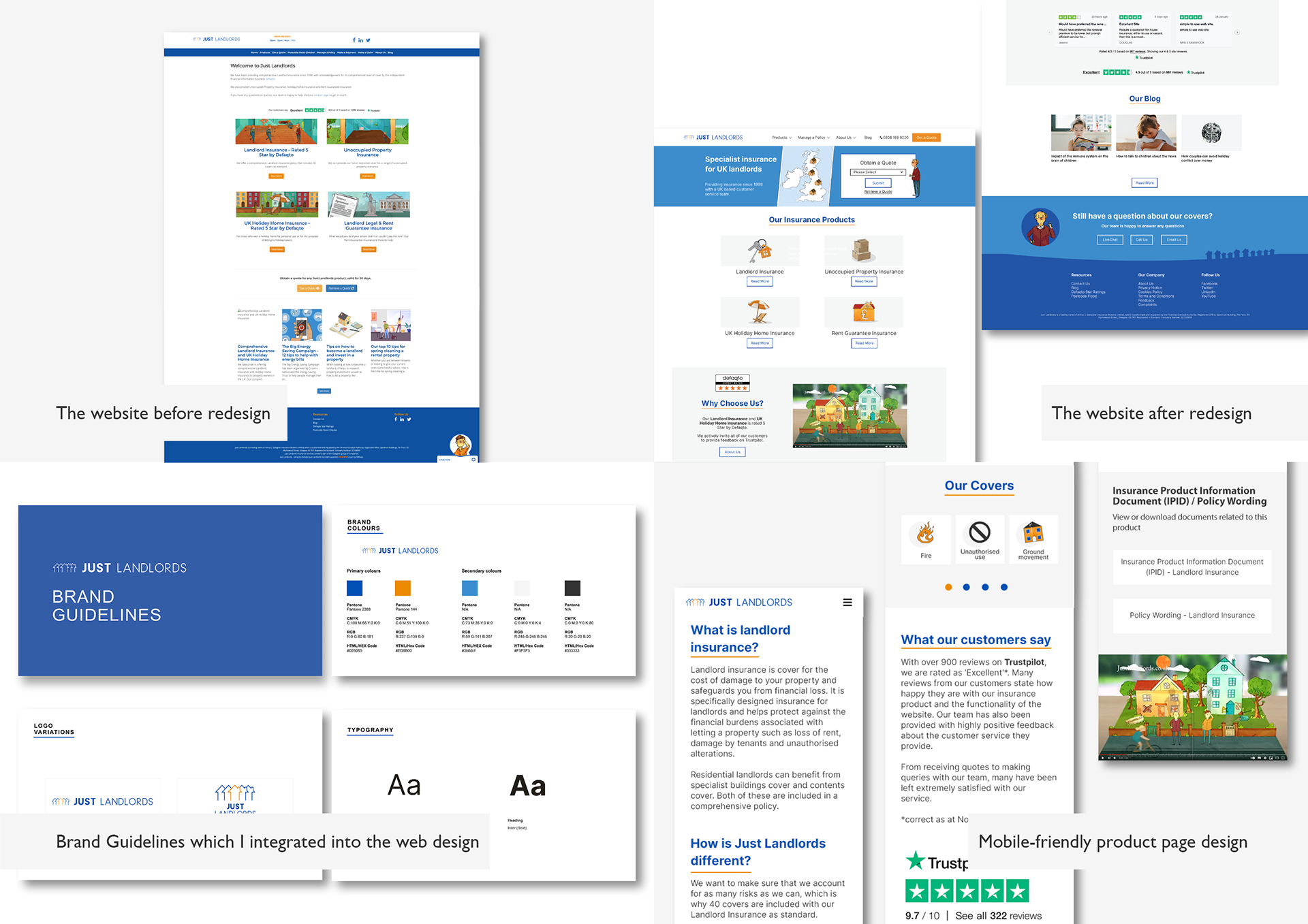 Develop a brand proposal created by an agency, consisting of one promotional video and four hand-drawn digital illustrations (bottom of the page). Using the defined visual style, produce both digital and print brand identities. The website redesign served as the primary focus to improve the onsite experience and increase the conversion rate. Just Landlords is a brand that provides specialist landlord and property-owner insurance in the UK.